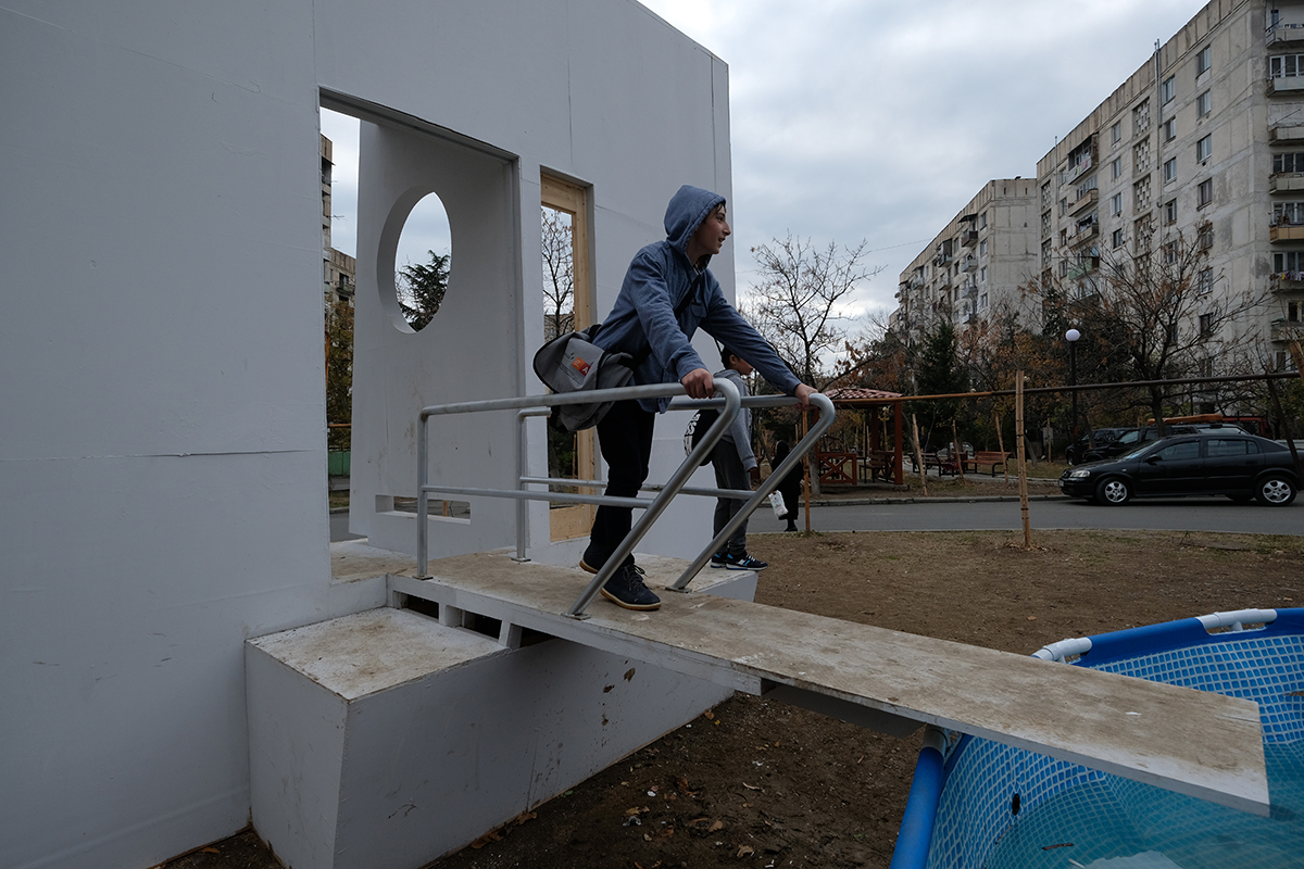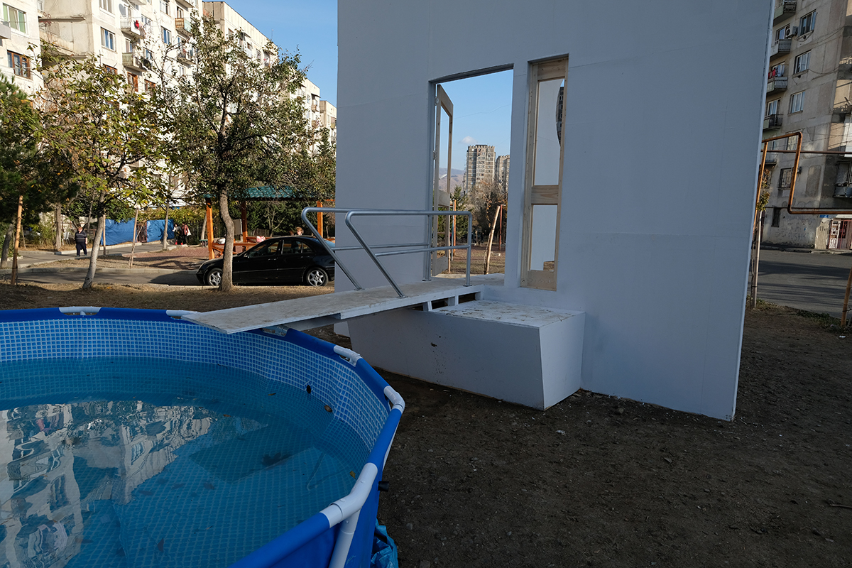 The core element and the departure point of the installation is the entrance into a socialist flat building that explores the facets of soviet modernism; in this case was used as a reference the replica of an entrance into the social house from Gldani district, Tbilisi (1970’s). The other important element is the backside of the building, so to speak, the passage through the wall guides trough a flexible wooden bridge that end up with the jumping board.