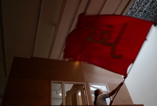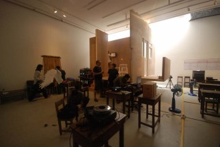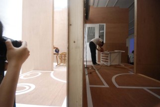 Another version of the Flat Space was installed in autumn 2009 at the Arthub Summit: The Making of the New Silk Roads in Bangkok. Exhibited in this version, the work takes on the appearance of a micro-construction built in a prefabricated materials factory. The lines drawn in paint inside are markings specific to architectural blueprints, indicating the places where the basic equipment of an apartment – cooker, sink etc. – to be installed, but they also seem to simulate a compositional scenery that would suggest to the visitors how to behave in this exhibition and performance space, much like the drawing made by Lars von Trier in Dogville. The apartment balcony was host to political speeches held under a flag appropriated by each speaker, while the inside hosted performances that generated objectual artworks.